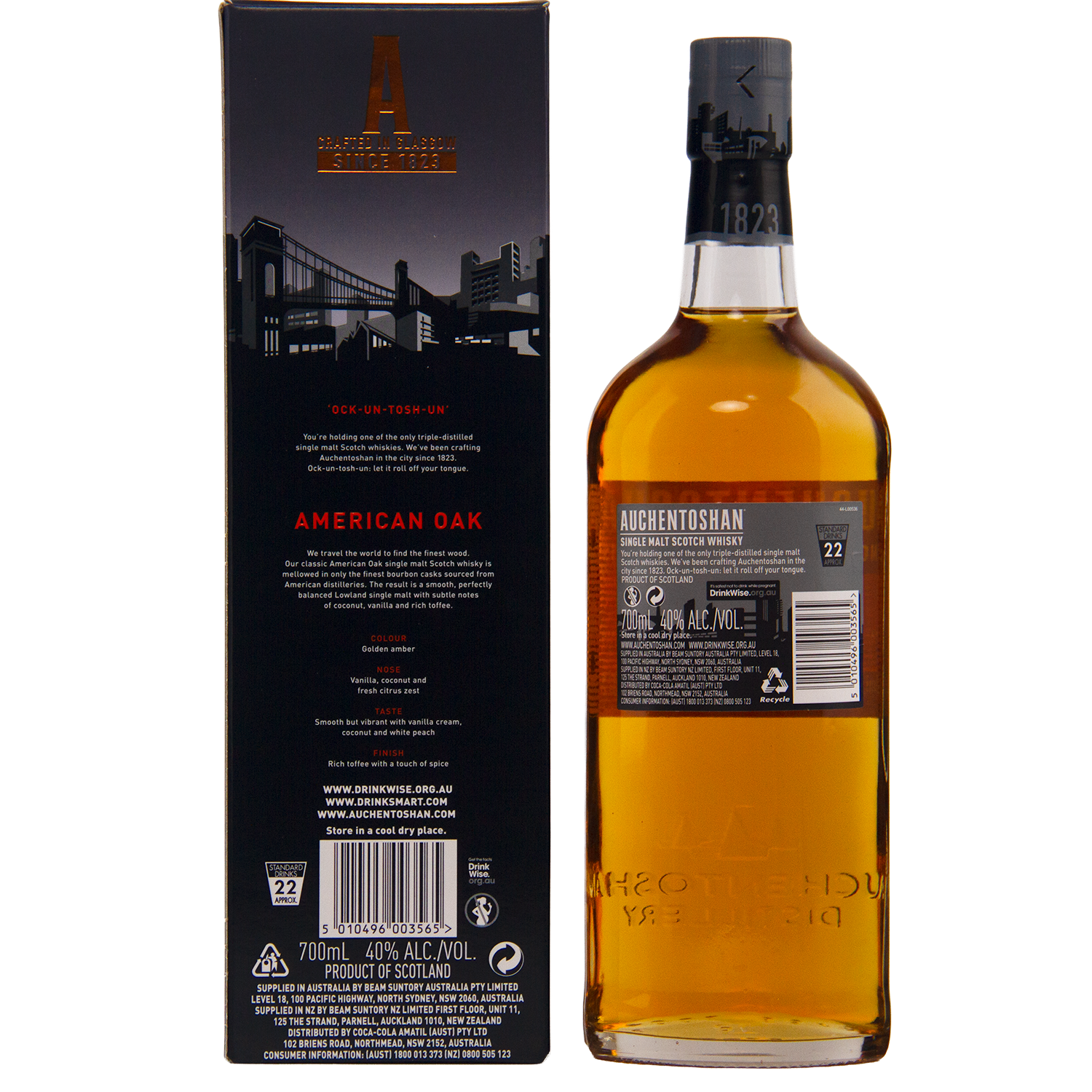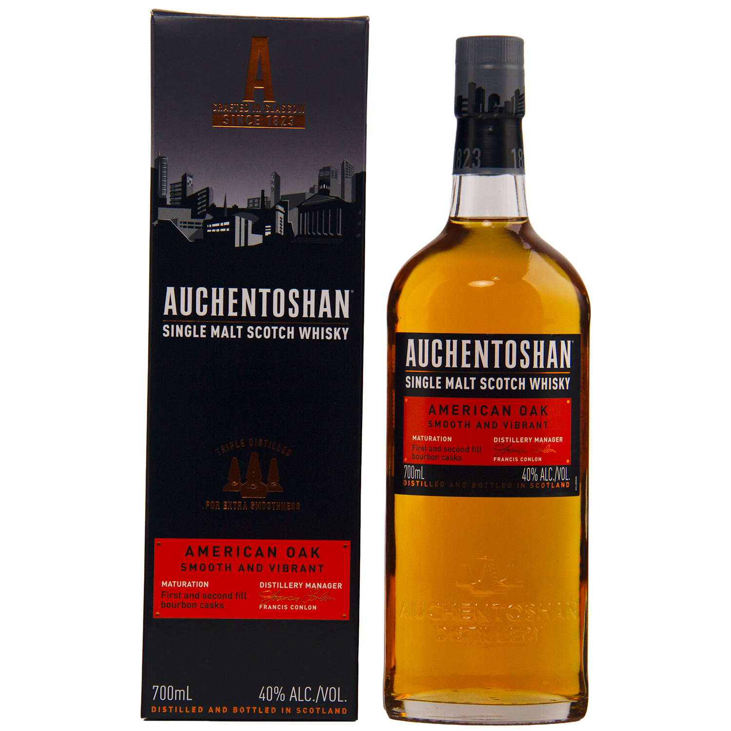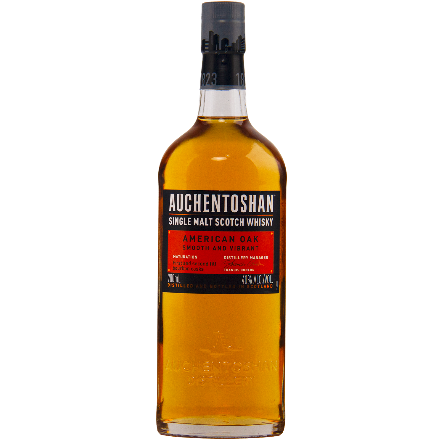 Matured exclusively in first-fill American oak ex-bourbon casks, Auchentoshan American Oak is a vibrant Lowland single malt whisky that showcases sweet vanilla and bright citrus flavours. Triple distilled for exceptional smoothness, this easy-drinking expression captures the clean, modern style Auchentoshan is known for. Bottled at 40% ABV, it offers bourbon-like character with the finesse of Lowland Scotch.