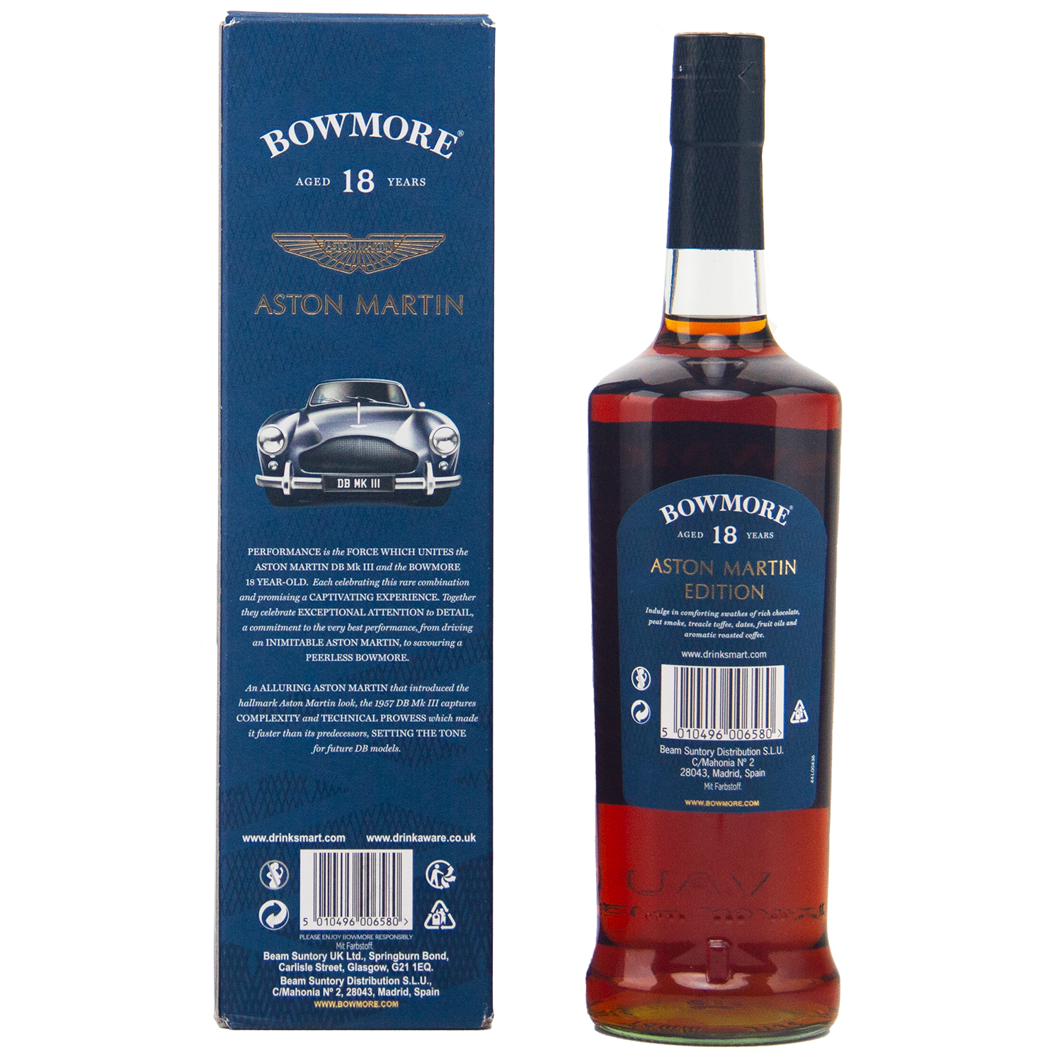As part of the limited Bowmore x Aston Martin series, this 18 Year Old release offers a luxurious combination of deep sherry cask influence and classic Islay peat. With its connection to the 1957 DB Mk III and collectible presentation, it’s a must-have for fans of refined single malts and vintage automotive heritage.