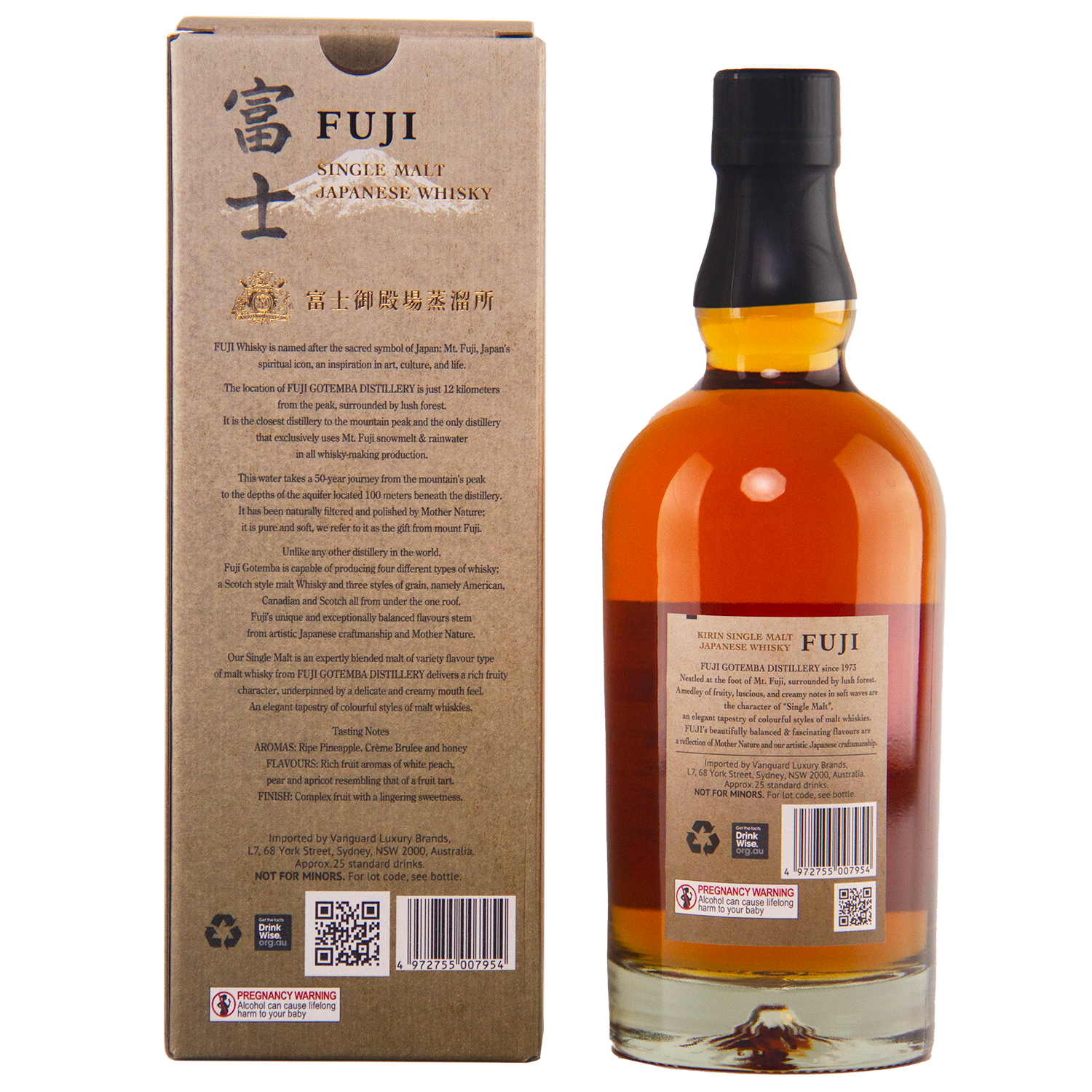 The Fuji Single Malt is a contemporary Japanese whisky crafted at the Fuji Gotemba Distillery, located at the foot of Mount Fuji. Inspired by traditional Scotch single malts but given a modern Japanese influence, this release showcases a creative use of casks, matured in a combination of ex-bourbon, beer-aged, and red wine barrels. Guided by Master Blender Jota Tanaka, the result is a layered and estery whisky that balances red fruits, orchard sweetness, and delicate spice. Bottled at 46% ABV, it exemplifies meticulous Japanese craftsmanship with a distinctive Fuji character.