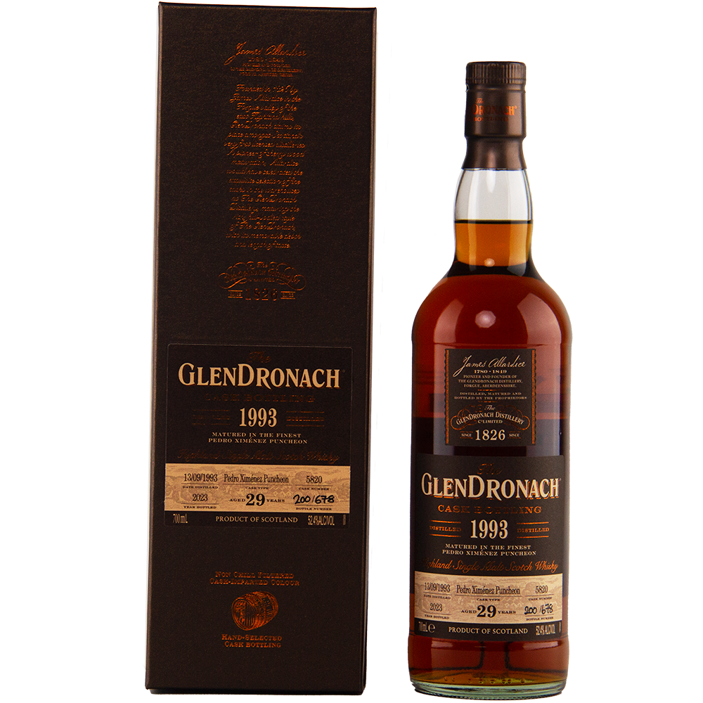 Cask #5820 is part of GlenDronach’s revered single cask programme, representing a prized 1993 vintage. With only 678 bottles produced, this long-aged Pedro Ximenez puncheon release offers exceptional depth and collectability. A remarkable example of GlenDronach’s sherry cask mastery, this is a standout bottle for any serious whisky collection.