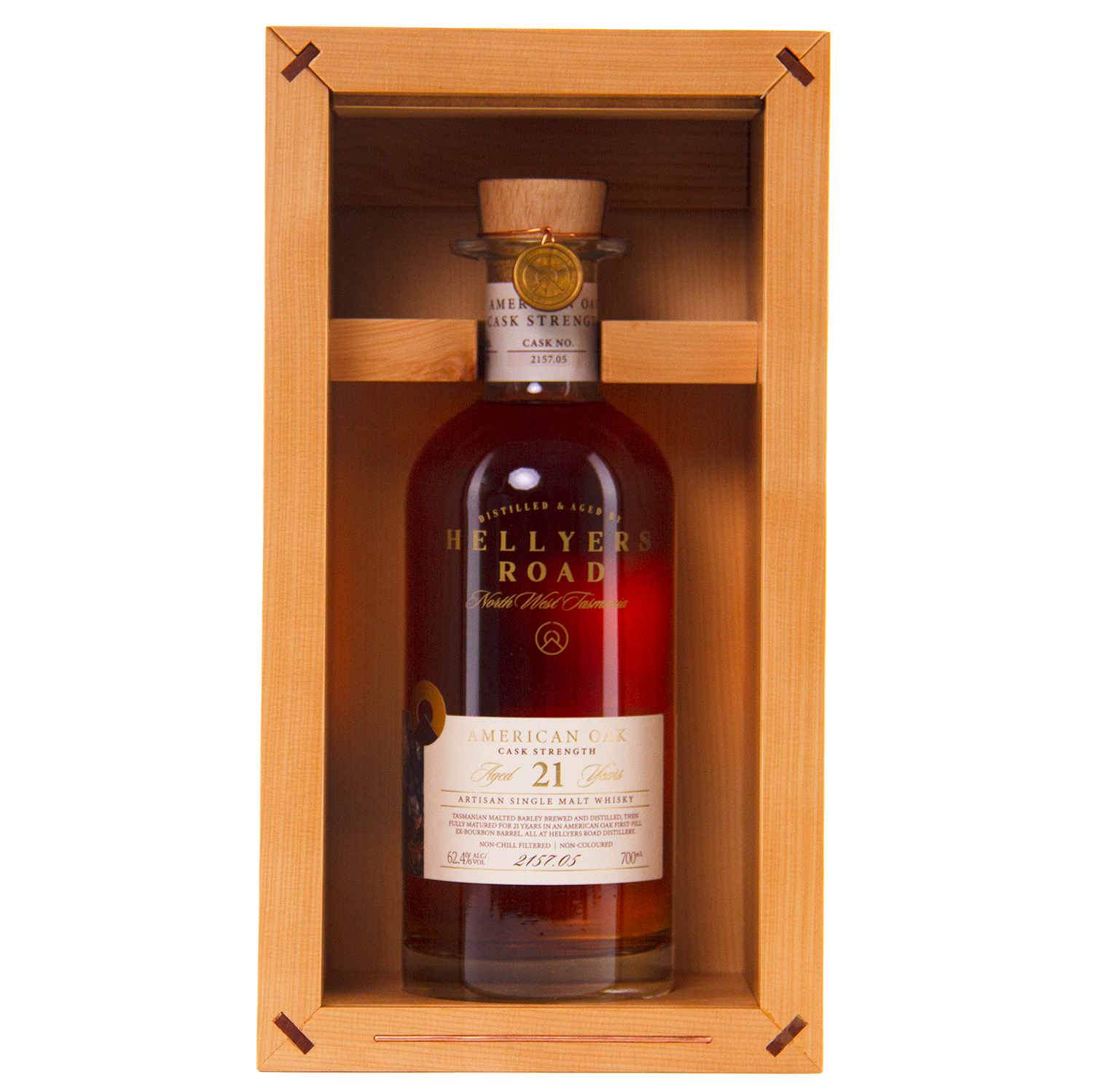 The Hellyers Road 21 Year Old Single Cask is the oldest official single cask bottling of Australian whisky to date, fully matured in American oak and bottled at natural cask strength. Distilled on 6 June 2002 and laid to rest in cask #2157.05 for over 21 years, this extraordinary release marks a historic milestone for both Hellyers Road and the wider Australian whisky industry. Bottled non-chill filtered with natural colour, it is presented in a handcrafted Tasmanian timber case designed by master woodworker Rob van Tholen, combining Huon Pine, Myrtle, and Celery Top Pine.