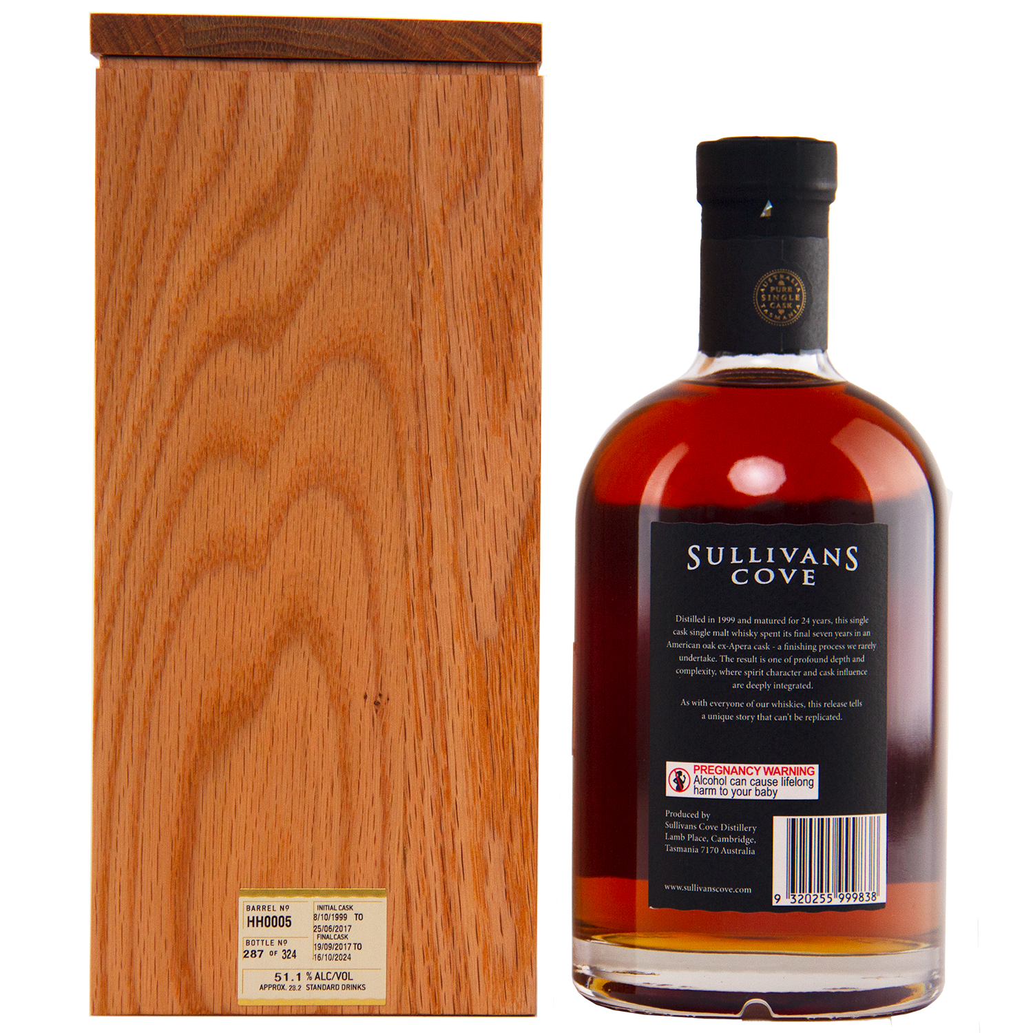 Matured for 17 years in a 300-litre American oak cask before being transferred to a 225-litre American oak ex-Apera cask for a further 7 years, this Old & Rare single cask release (HH0005) was first filled in October 1999 and decanted in October 2024. Yielding just 324 bottles at 51.1% ABV, it stands as a bold example of Sullivans Cove’s long-term maturation philosophy. Rich and textural, this whisky brings together power and delicacy through an extended double maturation process.