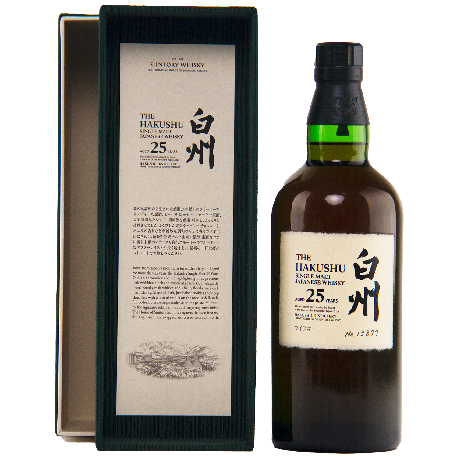 The Hakushu 25 Year Old is a rare, ultra-aged single malt whisky from Suntory’s famed Hakushu Distillery, nestled deep within the lush forests of Mt. Kaikomagatake in Japan’s Southern Alps. Founded half a century after Yamazaki, the Hakushu Distillery was the vision of Keizo Saji, Suntory’s second Master Blender, who sought the ideal natural environment to produce a delicately aromatic and verdant whisky.