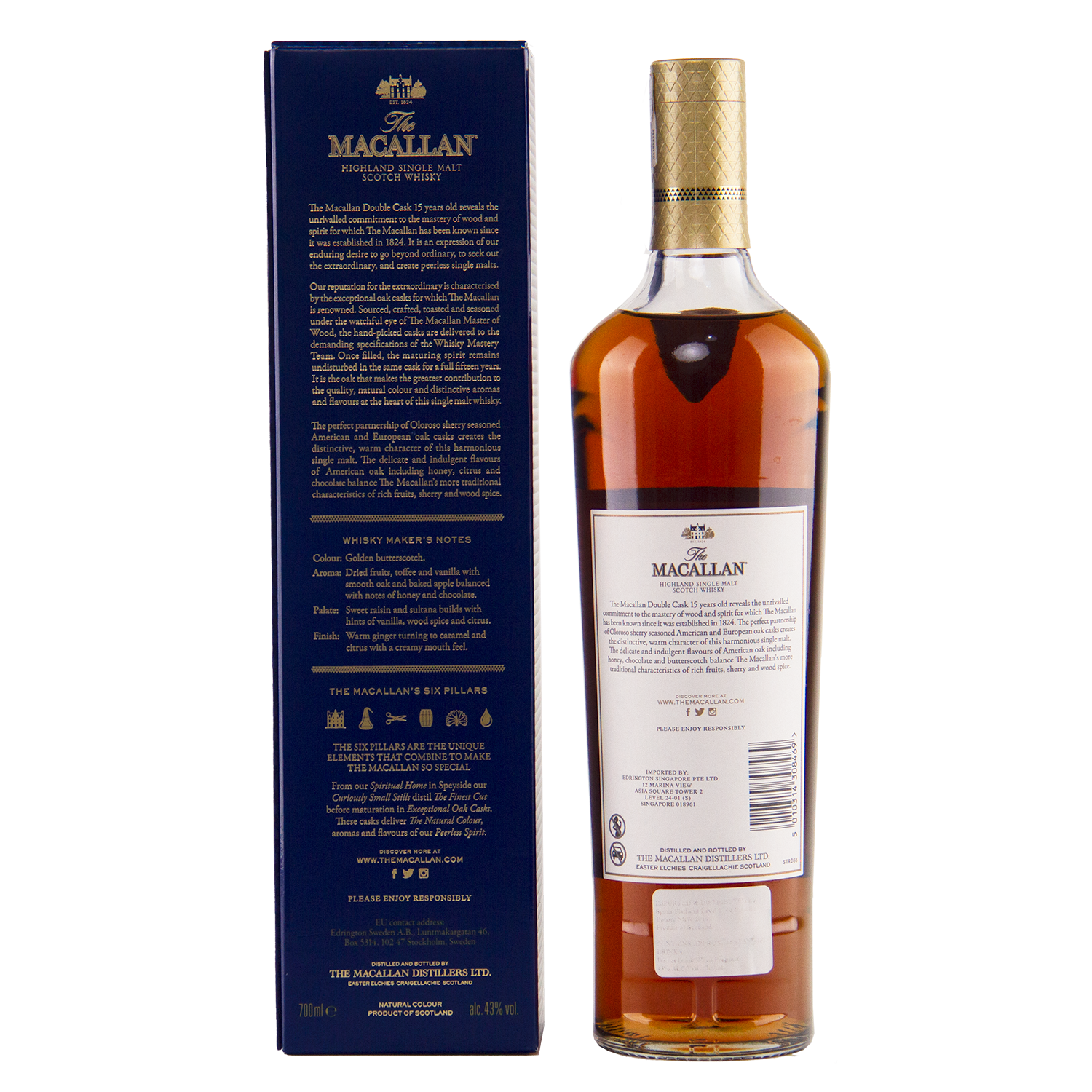 The Macallan Double Cask 15 Year Old is matured in a combination of American oak and European oak casks, both seasoned with sherry. This carefully balanced dual maturation highlights The Macallan’s renowned craftsmanship, creating a whisky that delivers depth, complexity, and elegance.